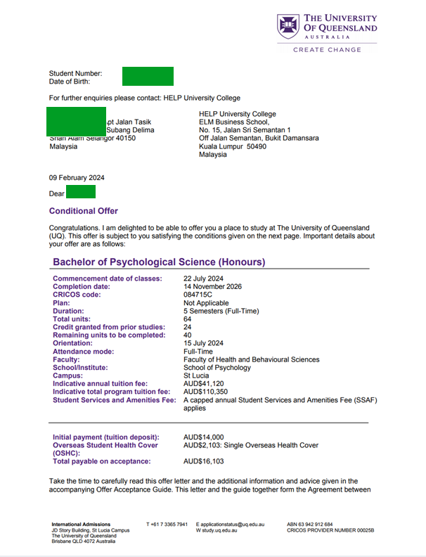 파운데이션 종료 이후에는 심리학이 잘 되어 있는 HELP University에 지원했는데, 당시 고등학교 서류의 진본 증명문제로 정말 비자가 제때 안나와서 정말 속을 썩였었어요. 비자 문제가 있긴 했지만, 2022년 부터 공부를 시작했고 오늘 연락이 와서는 호주의 세계적인 명문대학인 University of Queensland (QS 2024 세계대학순위 43위)의 심리학과로 편입학이 되었다는 연락이 왔네요.